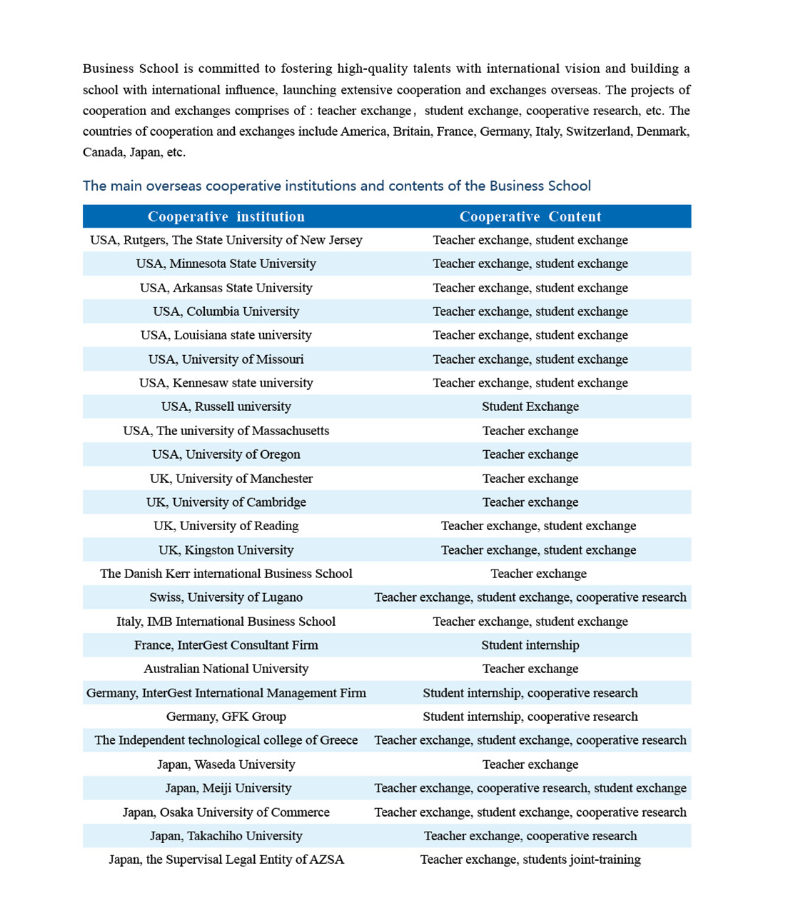 Business School is committed to fostering high-quality talents with international vision and building a school with international influence, launching extensive cooperation and exchanges overseas. The projects of cooperation and exchanges comprises of : teacher exchangestudent exchange, cooperative research, etc. The countries of cooperation and exchanges include America, Britain, France, Germany, Italy, Switzerland, Denmark, Canada, Japan, etc.