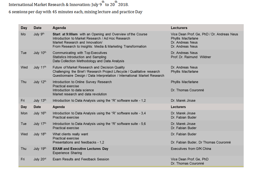 This course is co-supported by Gfk Vereinand invites experts either from business practice and from academia. The courseis on the subject of market research and teaches qualitative andquantitative research methods along with the ways of designing market research,collecting data and utilizing analytical tools. Via lectures and casediscussions, participants are able to have abundant access to the mostup-to-date theories and hands-on experiences. Certificates will be provided byboth CUFE and GfK after the course ends and all relevant criteria met.Additionally, GfK would like to provide the top students in class with theopportunity of having an internship in its Chinese branch.
