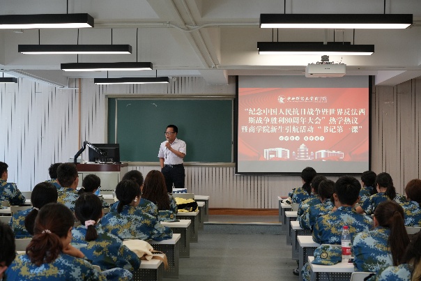 9月3日,纪念中国人民抗日战争暨世界反法西斯战争胜利80周年大会在北京天安门广场隆重举行。bv伟德国际1946组织全体2025级本科新生集体观看并开展热学热议活动。bv伟德国际1946党委书记李跃新与新生一同热议庆祝大会,为同学们科普二战知识。随后,李书记就家国情怀为主题为同学们讲授“书记第一课”,李书记将家国情怀具象化,深入浅出地讲述了家国情怀在生活中的体现,强调责任与担当对于新时代青年的重要性。