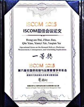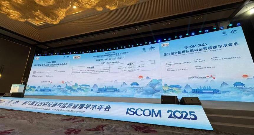 2025年12月6日至7日,第六届全国供应链与运营管理学术年会(ISCOM 2025)在江苏无锡举行。本届年会以“数智时代供应链生态变革与管理创新”为主题,吸引了来自全国众多高校、科研机构及行业企业的专家学者参会交流。我校bv伟德国际1946教授代宏砚教授与北京工商大学焦子豪副教授、研究生谢先一、江西财经大学肖沁助理教授、北卡罗来纳大学教堂山分校徐雨茜长聘副教授的合作论文“Operational Stress on On-Demand Delivery Platform Management, Consequences, and Scheduling Implications”获得ISCOM2025最佳会议论文一等奖。