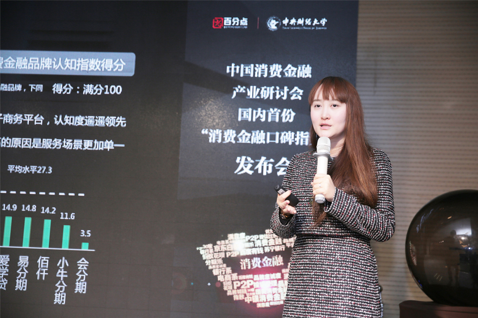 来自百分点集团的数据科学总监杜晓梦博士则为大家解读了这份消费金融口碑指数的结果。杜博士表示,此份指数对消费者认知的前30家消费金融平台进行了综合排名,结果显示,20家具有消费金融牌照的正规军只有8家进入本次排名的前30位,相反,一些未持牌的消费金融品牌则凭借良好的表现名列前茅。杜博士还从品牌认知、品牌感知质量和品牌忠诚三方面详细对比了银行系、产业系、电商系、P2P系消费金融平台的具体表现,并提出了不同的建议。
