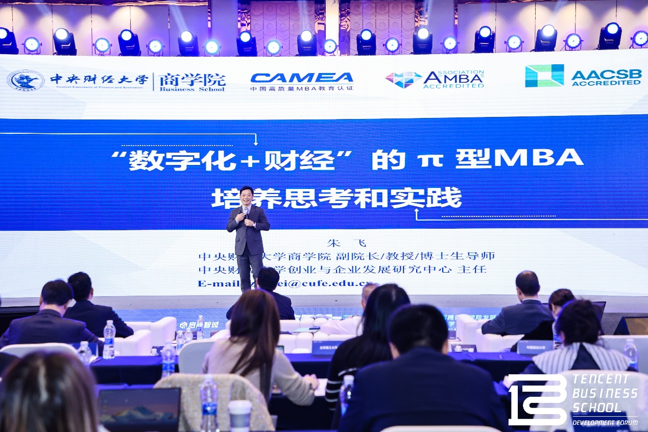 在主题演讲环节,伟德victor1946MBA教育中心副主任兼bv伟德国际1946副院长朱飞教授以“‘数字化+财经’的π型MBA培养思考和实践”为题,发表了主题演讲。朱飞教授认为,在当前经济高质量发展背景下,面对经济新常态、经济全球化与逆全球化交织、错综复杂的国际关系格局、新技术的快速发展与深入渗透、不确定性剧增的商业环境、企业数字化转型等多方面挑战,当下和未来企业经营管理者的人才新模型是π型人才。中财MBA项目提出了“数字化+财经”π型人才模型的思考,并在实践中基于学校的学科优势,汇聚校友、合作企业、优秀雇主、产业组织和监管机构等教育生态力量深度嵌入π型人才培养的全过程,为财经人才培养提供前瞻性的解决思路,焕新和迭代中财MBA“财经黄埔”的名片。