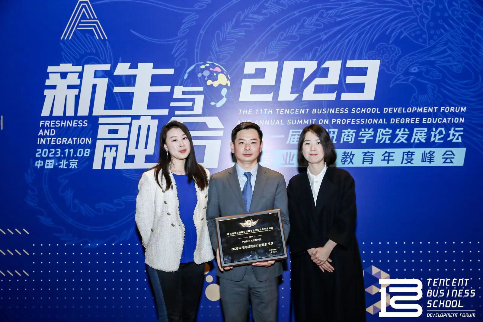 2023年11月8日,以“新生与融合”为主题的第十一届腾讯bv伟德国际1946发展论坛暨专业学位教育年度峰会在北京成功举行。本届论坛汇聚了行业的决策者、领先者、学术专家及创新领袖、院校代表等近200人国内外嘉宾参会,共同为高等教育行业高质量可持续发展建言献策。bv伟德国际1946受邀参加此次论坛,并荣获“2023年度商科教育行业标杆品牌”荣誉。MBA教育中心副主任兼bv伟德国际1946副院长朱飞教授荣获“2023年度商科教育杰出学者”荣誉,并发表主题演讲。中财MBA招生推广大使团团长郭子瑶、副团长方溪文应邀出席了此次论坛。