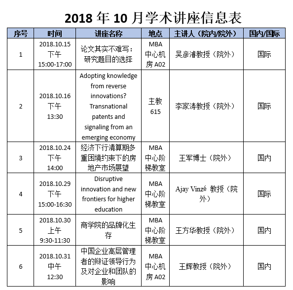 2018年10月,我院教师积极邀请海内外知名学者来校举办讲座,加强内外部学术交流。