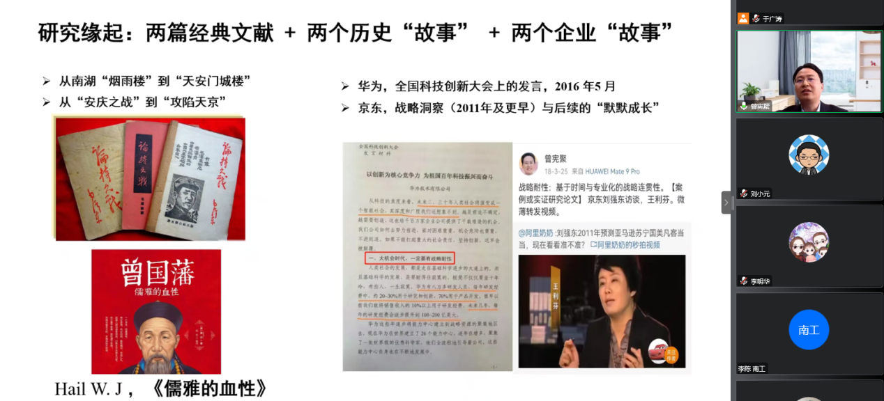 在80多分钟的讲座中,曾教授不仅系统地阐述了战略耐性的学术思想,而且具体展示了变革时代一个学者的思考历程,充分诠释了作为中国管理学者研究中国问题和讲述中国故事的责任担当:从基于实践观察的一种隐约感觉,到逐渐提出一个富有洞见的学术概念,再到一系列系统深入的案例研究和理论思考,最终形成一个具有探索性的理论框架。