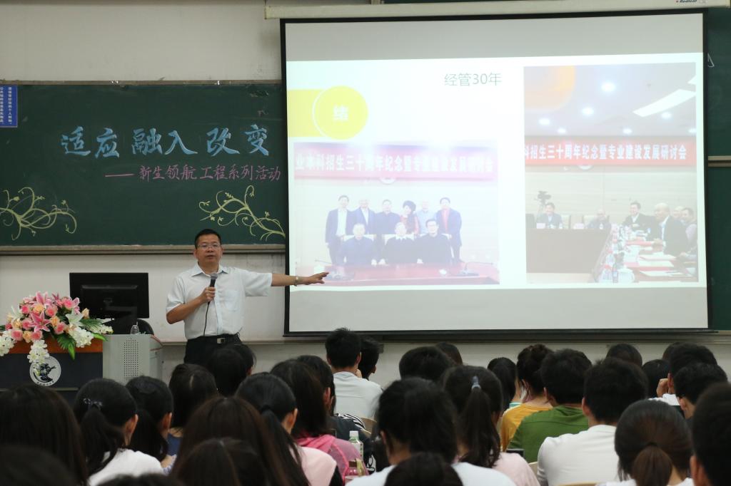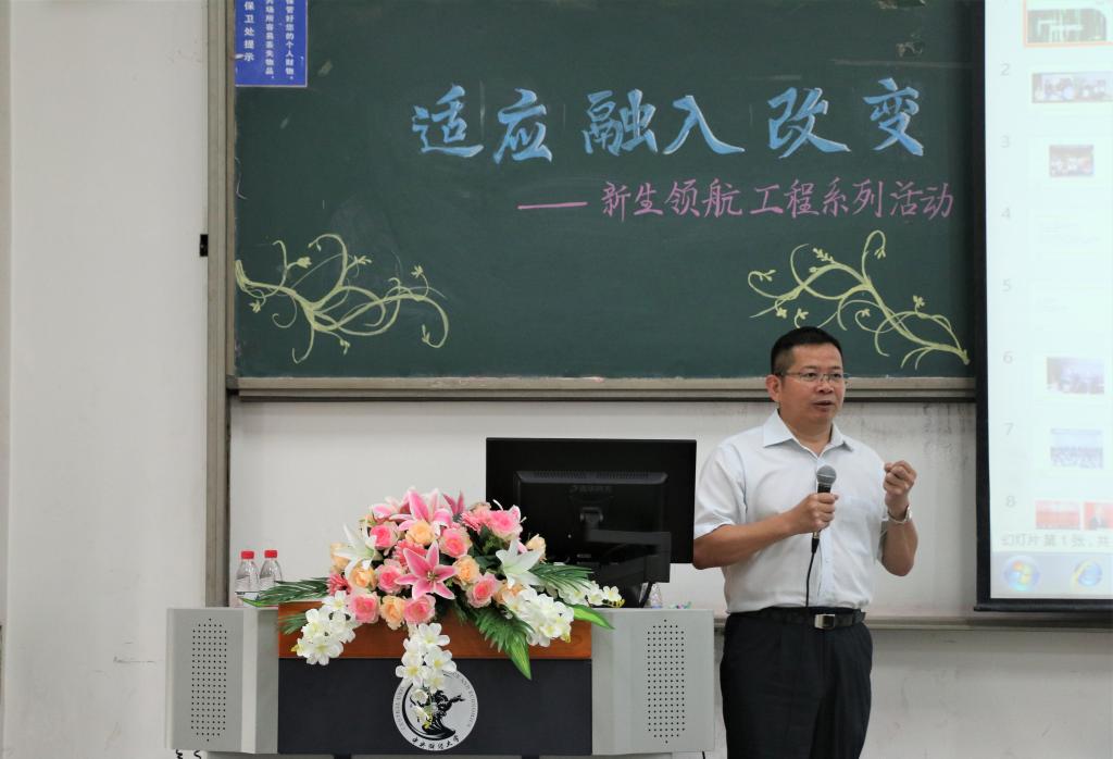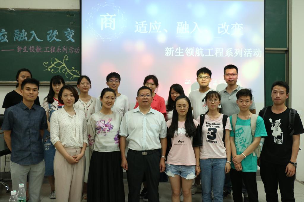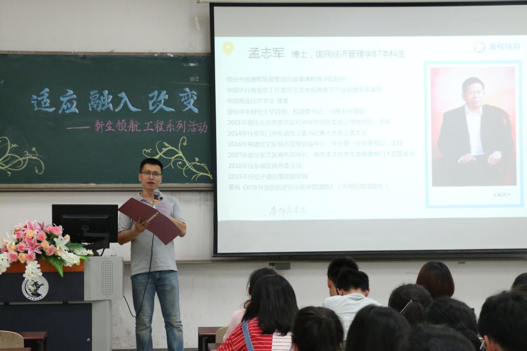 2018年5月16日下午,bv伟德国际1946邀请到我校经管系87级校友、康辉旅游集团总裁孟志军来到沙河校区,在主教214为全院大一学生做了以“适应、融入、改变—新生领航工程系列活动”为主题的讲座。bv伟德国际1946学工办主任、17级辅导员张碘老师主持了本次讲座,bv伟德国际1946团委书记、15级辅导员王婷婷老师出席活动,并与嘉宾和观众进行了深入的交流。