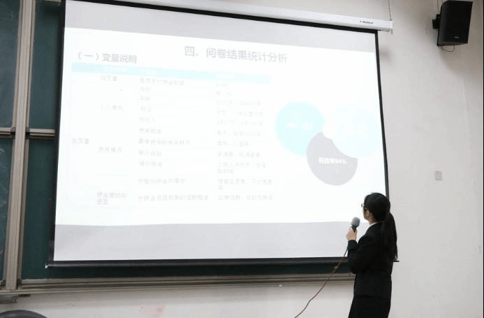 第二组同学则以信息化时代大学生就业和企业招聘的双向博弈为市场调研的主题,从研究背景、研究思路、调查实施过程、结论与建议几个方面介绍了整个小组成果。