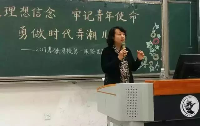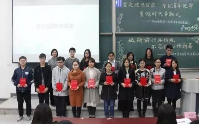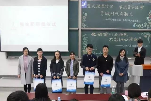 新生团员是此次基础团校培训的重点,2017年9月,bv伟德国际1946团委接收了246名新生团员,成立了7个新生团支部。为了加强新生团支部建设,举办了接收新生团员仪式。由优秀团员代表为新生团员代表佩戴团徽,研究生会主席马雅璇与17-1班芮+导师潘昊宁向新生团支部发放“薪火相传”团务工作资料包。