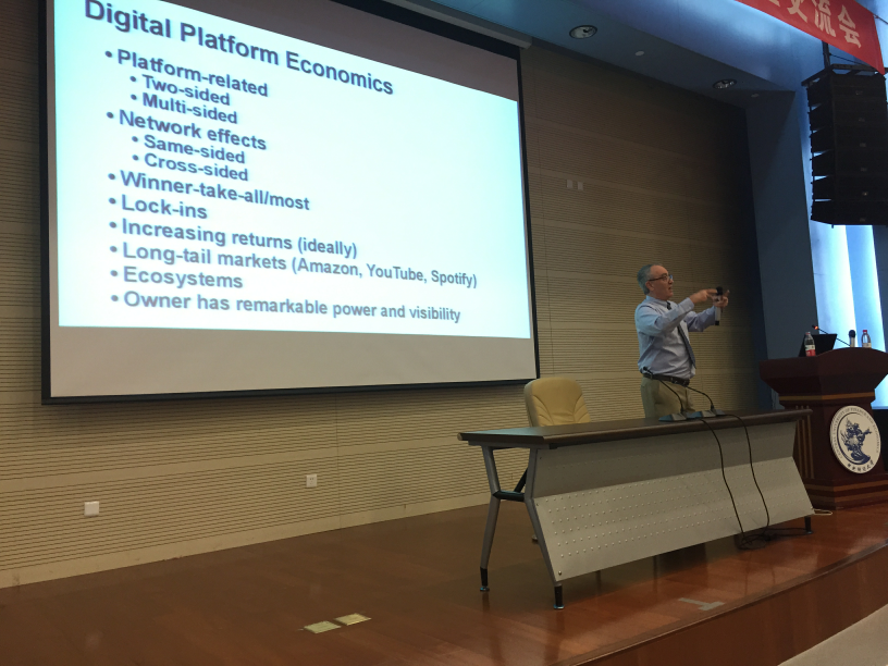 9月11日,在学院南路校区学术会堂402,Kenney教授为师生们带来了主题为“The rising of the platform economy: understanding the digital giants”的公开学术讲座,分享了他的最新研究,探讨了基于互联网的平台商业模式,比如当今领先的平台企业阿里巴巴、亚马逊、百度、脸书、谷歌以及腾讯等,其如何正在重塑商业社会的竞争、就业、以及价值创造方式。与此相对应的,那些非平台企业、就业者以及政府监管者正在被这些平台企业深深卷入到新的竞争、以及价值创造方式和价值创造过程中。不可否认的是,数字平台商业模式正在重塑资本的流动和价值创造,各行各业无一幸免。讲座的内容引发了大家积极的讨论。
