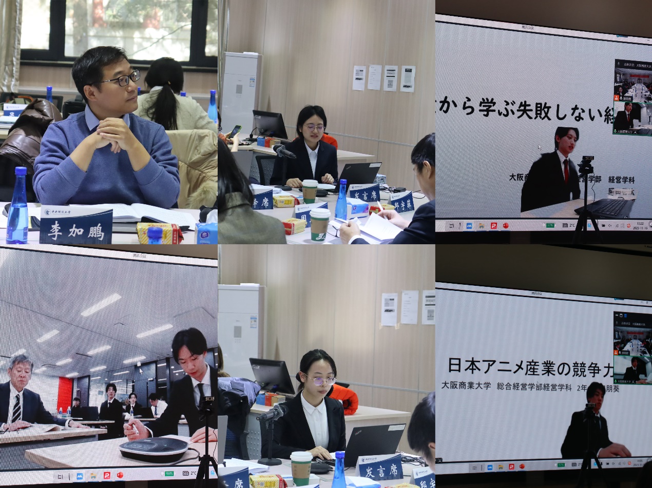 汇报结束后,伟德victor1946周卫中教授和大阪商业大学北室康一准教授分别对学生的报告内容和汇报表现进行点评。周卫中教授对本届研讨会演讲学生的选题和现场表达给予了高度肯定。同学们能够关注到自己生活环境中非常重要的现实问题,这本身就值得鼓励。对于每位学生展示方案的改进,周教授从理论与实践两方面提出了中肯的建议。作为中方教师,周教授感谢两校师生的共同付出,奉献了一场如此精彩的研讨会。北室康一准教授对学生们“找真问题”“挖掘本质”的研究作风表示赞扬,并再次感谢学生们的辛苦付出。