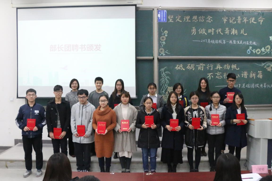 新生团员是此次基础团校培训的重点,2017年9月,bv伟德国际1946团委接收了246名新生团员,成立了7个新生团支部。为了加强新生团支部建设,举办了接收新生团员仪式。由优秀团员代表为新生团员代表佩戴团徽,研究生会主席马雅璇与17-1班芮+导师潘昊宁向新生团支部发放“薪火相传”团务工作资料包。