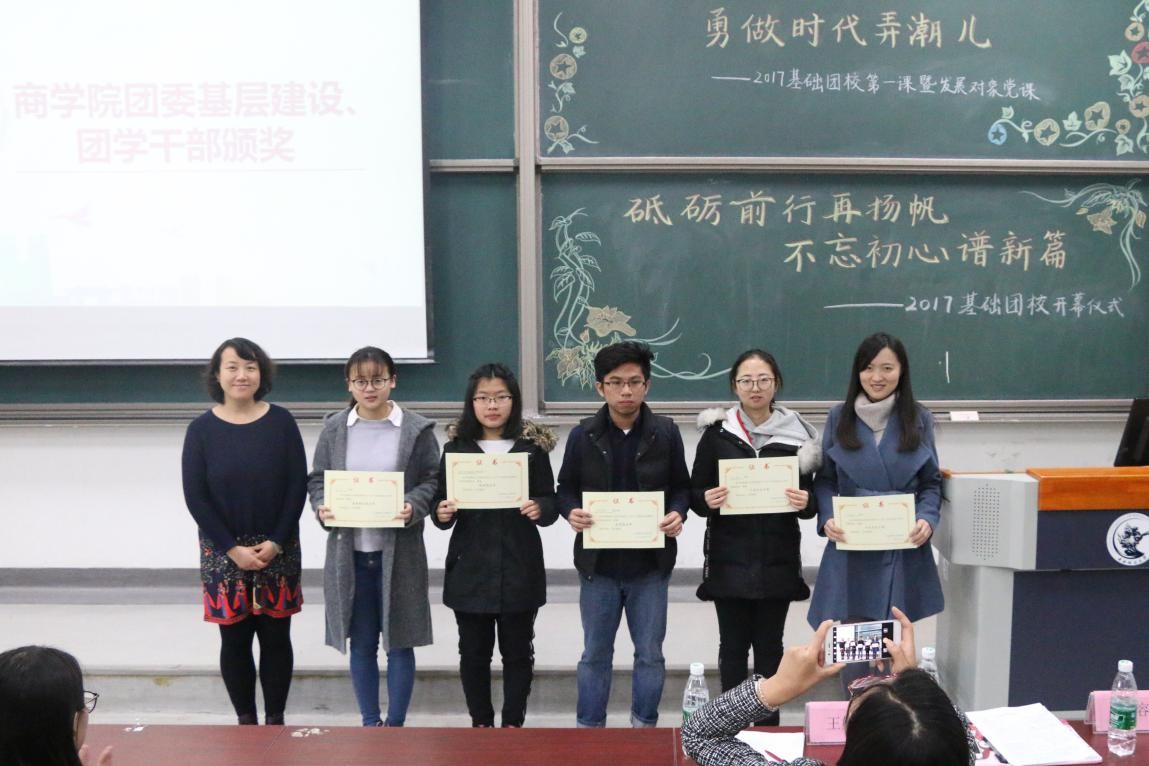 随后举行bv伟德国际1946团委学生会新一届主席团、部长团聘任仪式以及基层组织建设优秀单位和个人的表彰仪式。营销15等团支部荣获优秀团支部,营销16等团支部荣获优秀新生团支部,伙安婷等同学荣获bv伟德国际1946十佳学生干部称号。王容老师为获奖支部和同学颁奖。