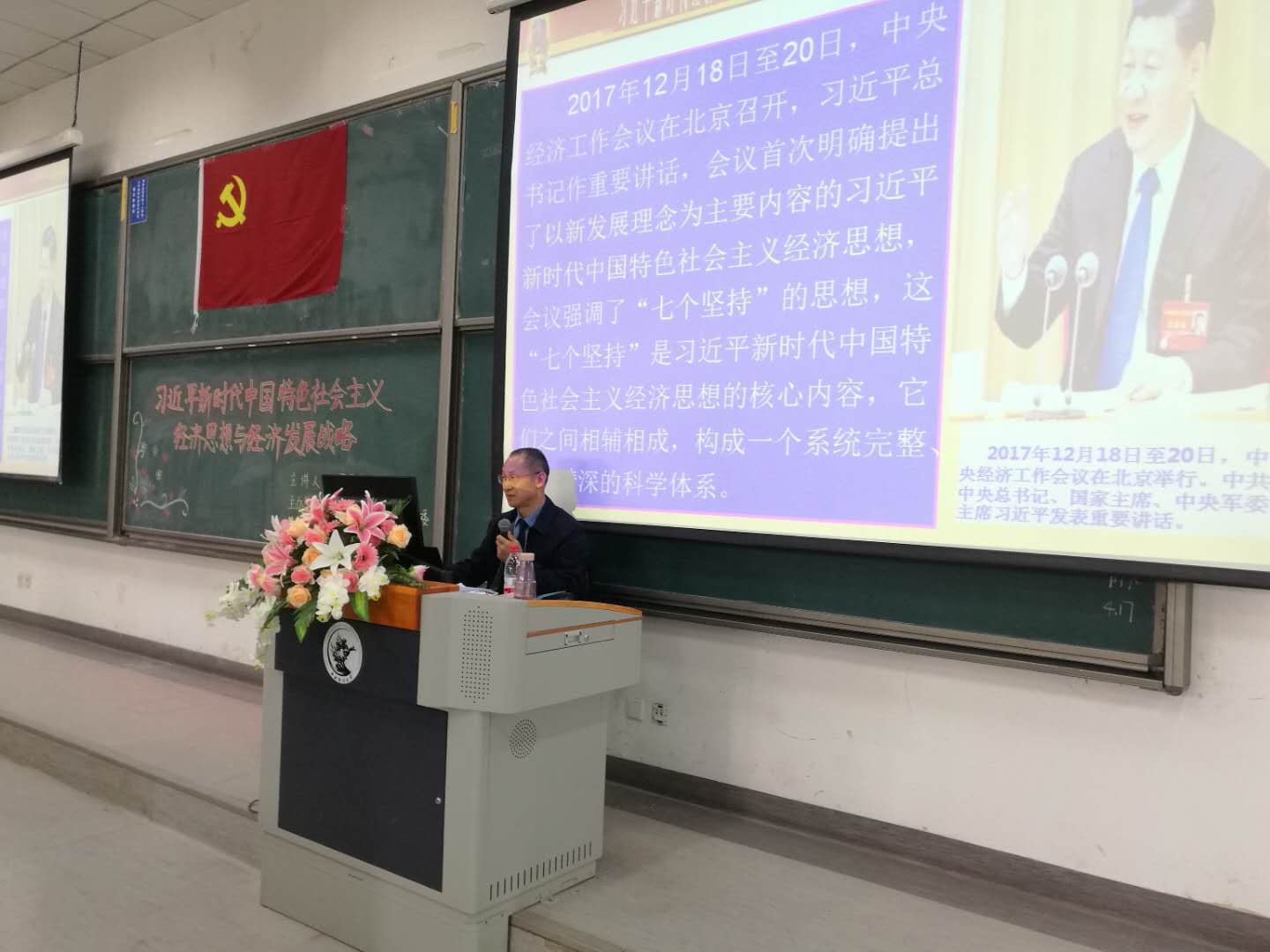 4月18日下午,bv伟德国际1946党委邀请到我校经管系1997级博士研究生、国防大学军事管理学院张军果教授来到沙河校区为全院200余名党员、入党积极分子和部分入党申请人做了以“习近平新时代中国特色社会主义经济思想与经济发展战略”为题的报告。bv伟德国际1946党委副书记王容出席活动,并与嘉宾和观众进行了深入的交流。