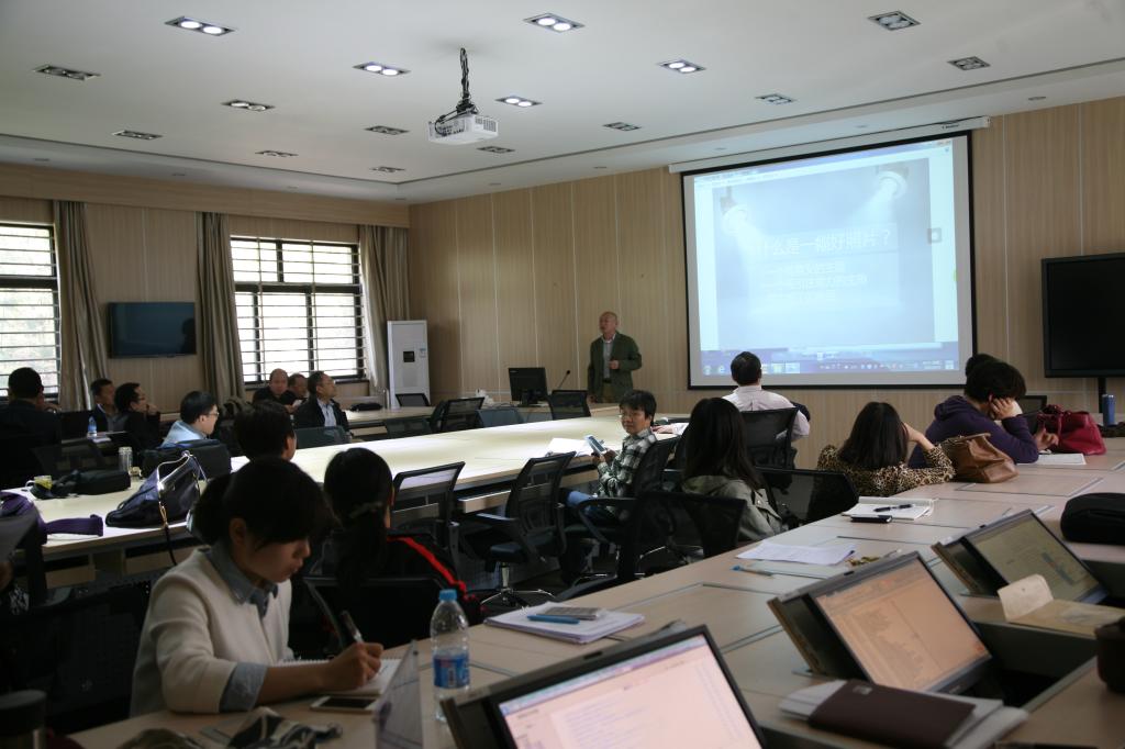 柴庆春老师主要从两个方面来讲解,首先是摄影器材的选择和使用,好的摄影器材方便并有助于拍摄出好的摄影作品,但是普通摄影器材也同样能拍出好的作品;其次,真正有意境或创意的摄影作品,主要体现在作者的创作用意、取景、摄影技巧的使用上。柴老师以自己丰富的摄影经验和摄影技巧,并结合自己的摄影作品给大家做了生动的讲解。老师们同时也积极回应和提问,课堂气氛活跃。