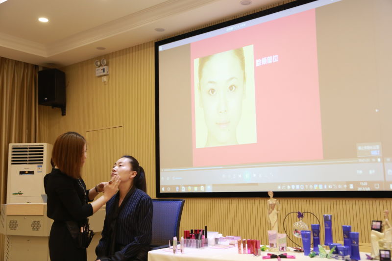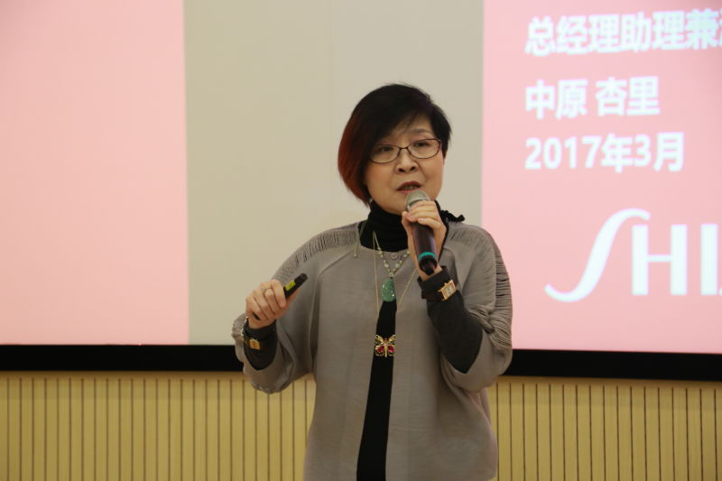 中原杏里女士简单介绍了资生堂的品牌后,重点为在座教工讲解了女性如何根据自身特质和优势进行化妆,特别是针对教师这个职业的化妆要求,以在讲台上向学生展示出自己最美的一面。
