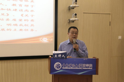 孙国辉副校长为学院全体教职工深度解读了教育部《关于加快建设高水平本科教育全面提高人才培养能力的意见》和《关于深化本科教育教学改革全面提高人才培养质量的意见》文件精神。首先他从“为什么要重视本科教育” “为什么要建设高水平本科教育”“为什么立德树人是根本任务”等基本问题出发,强调了以本为本,建设一流本科,为党育人,为国育才对建设教育强国、实现中华民族伟大复兴的重要意义。建设一流本科要以习近平新时代中国特色社会主义思想为指导,全面贯彻落实党的十九大精神,全面贯彻党的教育方针,坚持“四为”方针,准确把握高等教育基本规律和人才成长规律,以“四个回归”为基本遵循,加强理想信念教育,厚植爱国主义情怀,强化课程思政建设,将思想政治教育贯穿本科教育全过程。其次,他从贯彻“以学生为中心”教育理念激发学生潜能的角度,全面介绍了全面推进本科教育改革创新的内容,重点联系我校实际,对学分制完善、专业供给侧改革、双学位和联合学位探索、培养方案完善、课程建设质量、教材编写、课堂革命、双创教育、协同育人机制、学生综合素质教育、学生学习过程管理、基层教学组织建设、教学激励、质量保障体系建设以及教育评价改革等工作分析了我校现状及今后主要任务