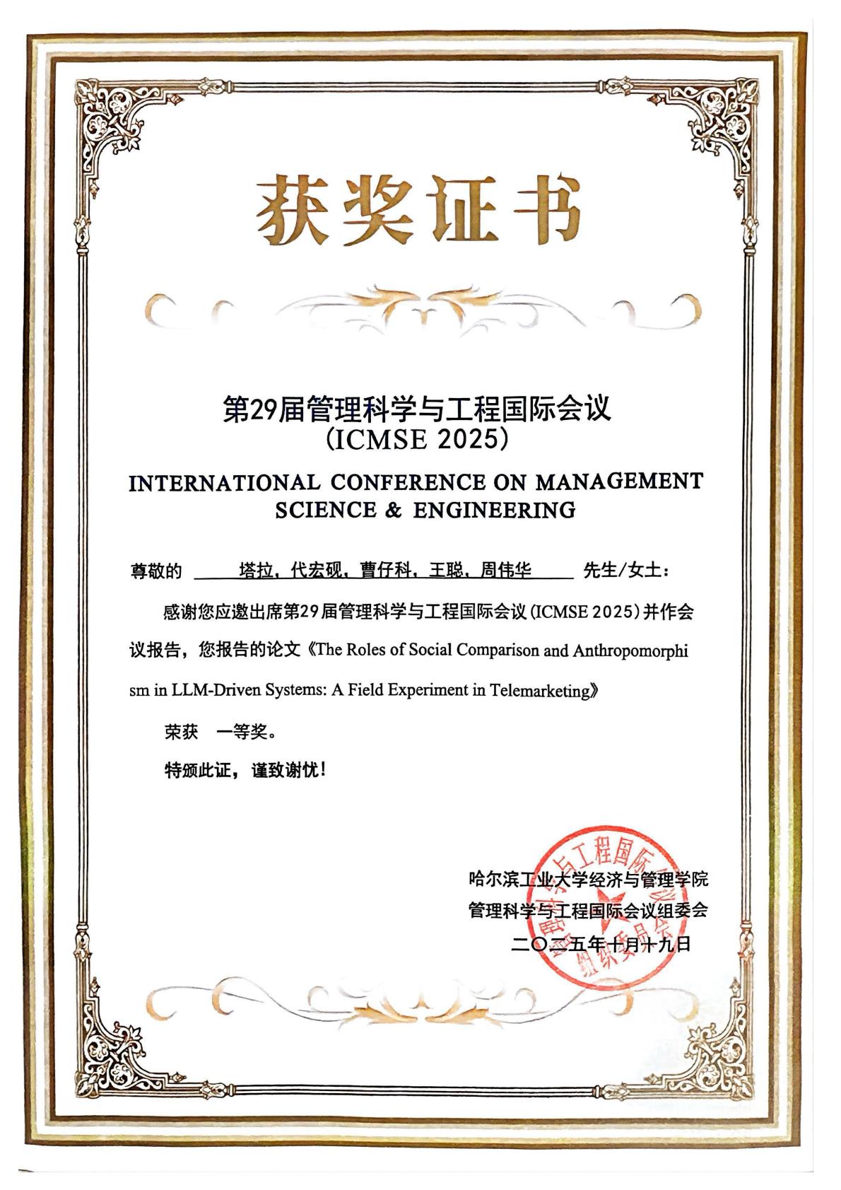 近日,我院代宏砚教授与清华大学塔拉博士后、北京大学王聪助理教授、浙江大学曹仔科长聘副教授及浙江大学周伟华教授合作撰写的论文《Social Comparison and Anthropomorphism in GenAI Performance Feedback: A Field Experiment》在第29届管理科学与工程国际会议获得优秀论文一等奖。管理科学与工程国际会议是汇聚全球学界、业界专家的跨学科交流平台,聚焦管理科学理论、工程技术方法与实际应用场景的深度融合。会议围绕智能...